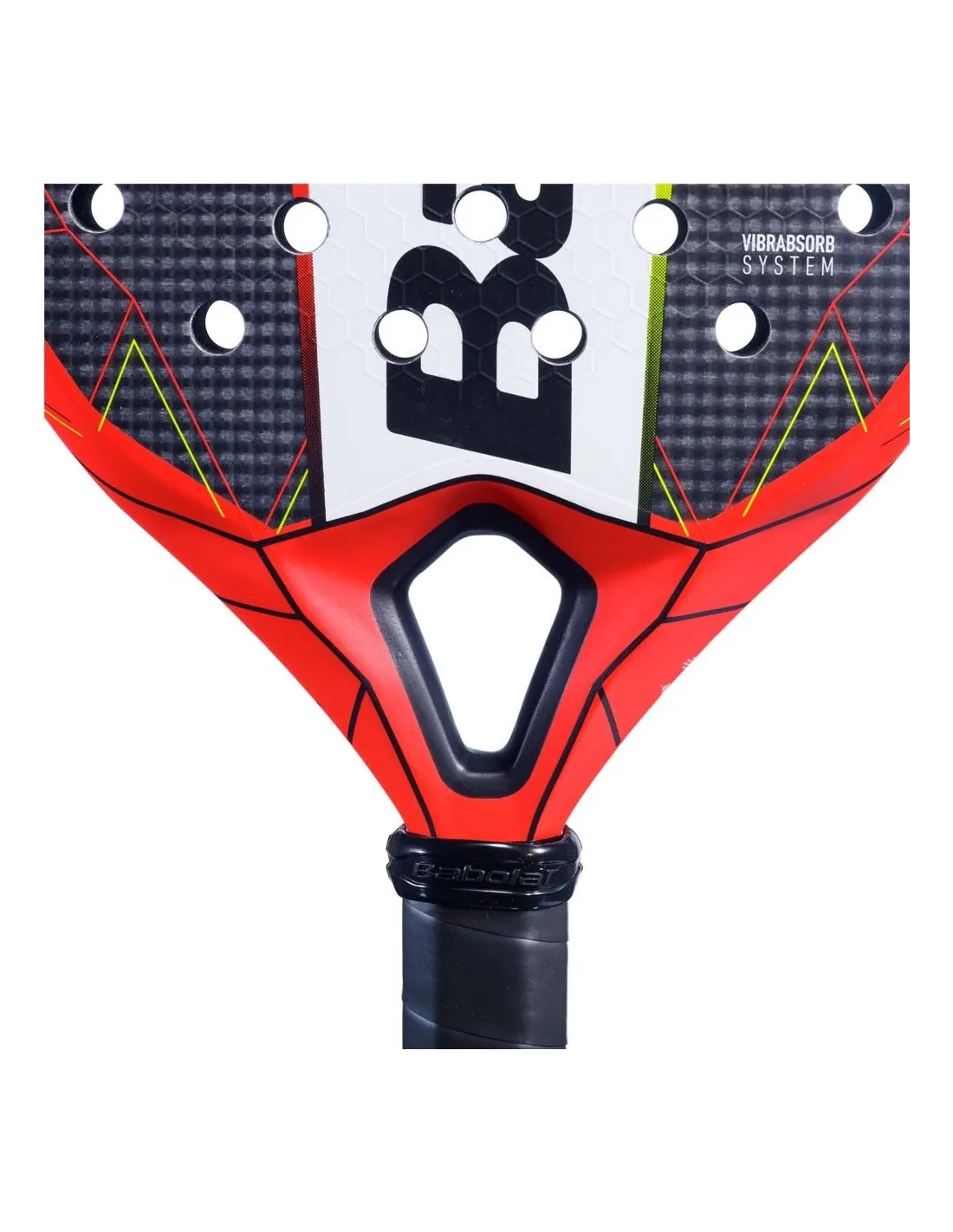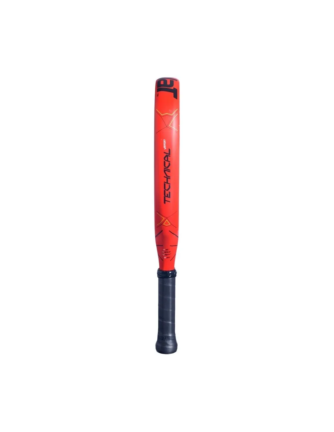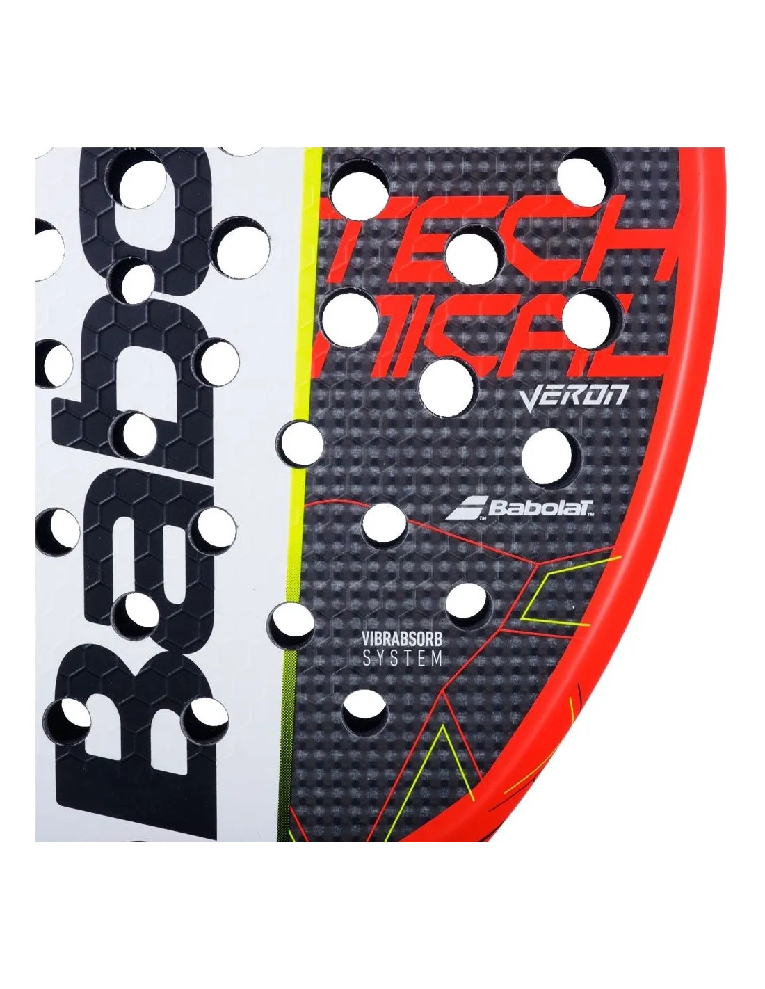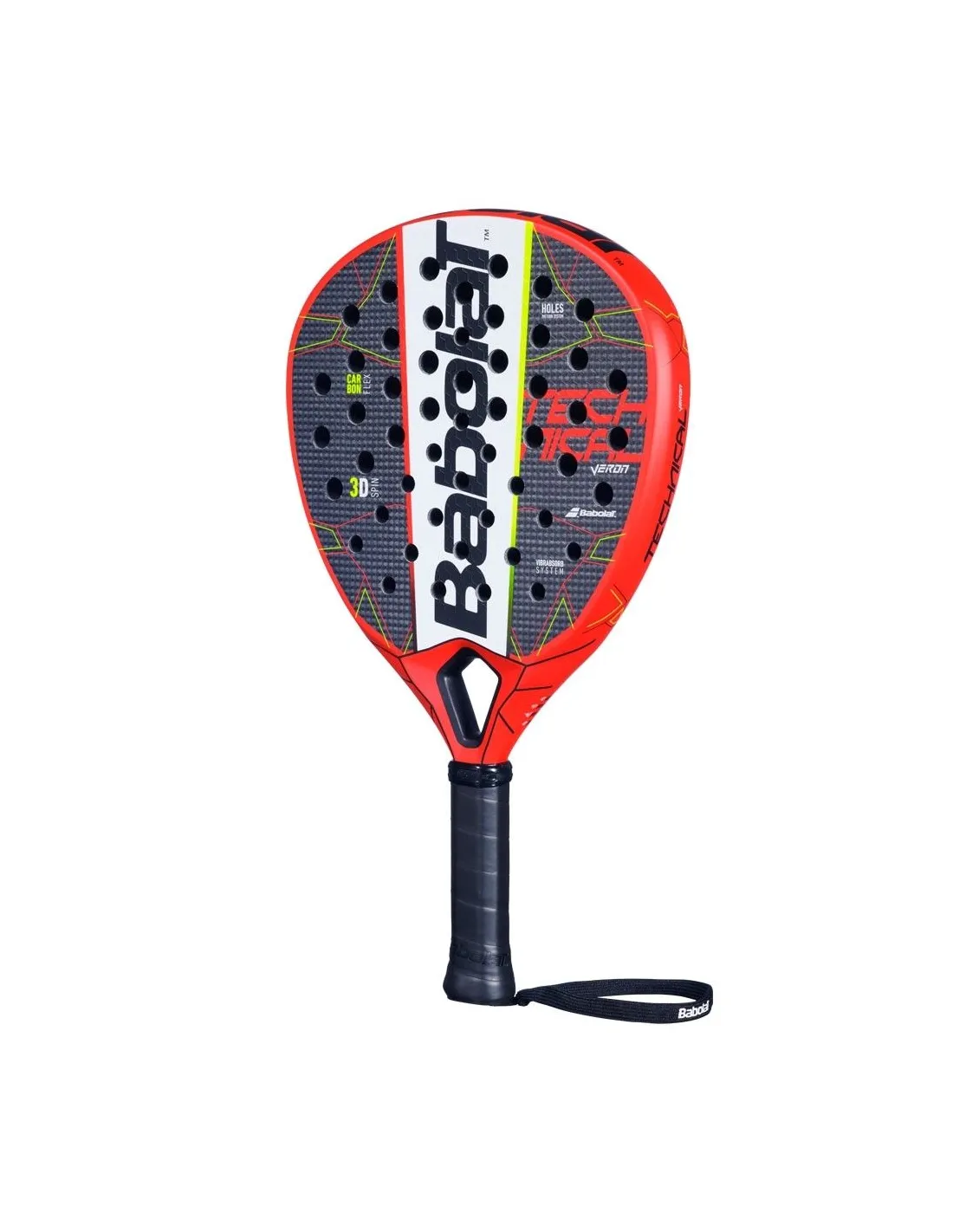 Das Modell Babolat Technical Veron 2022 präsentiert ein modernes und lebendiges Design, das Schwarz mit Details in Rot und fluoreszierendem Gelb kombiniert. Seine Diamant-Form und glatte Oberfläche verleihen ihm einen eleganten Touch.