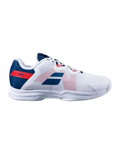 Die Schuhe für Padel von Babolat Sfx3 All court in Weiß Blau sind ideal für Spieler auf mittlerem und fortgeschrittenem Niveau. Sie sind perfekt für diejenigen, die bequeme Schuhe suchen, die auf anspruchsvollen Plätzen maximale Leistung erbringen.