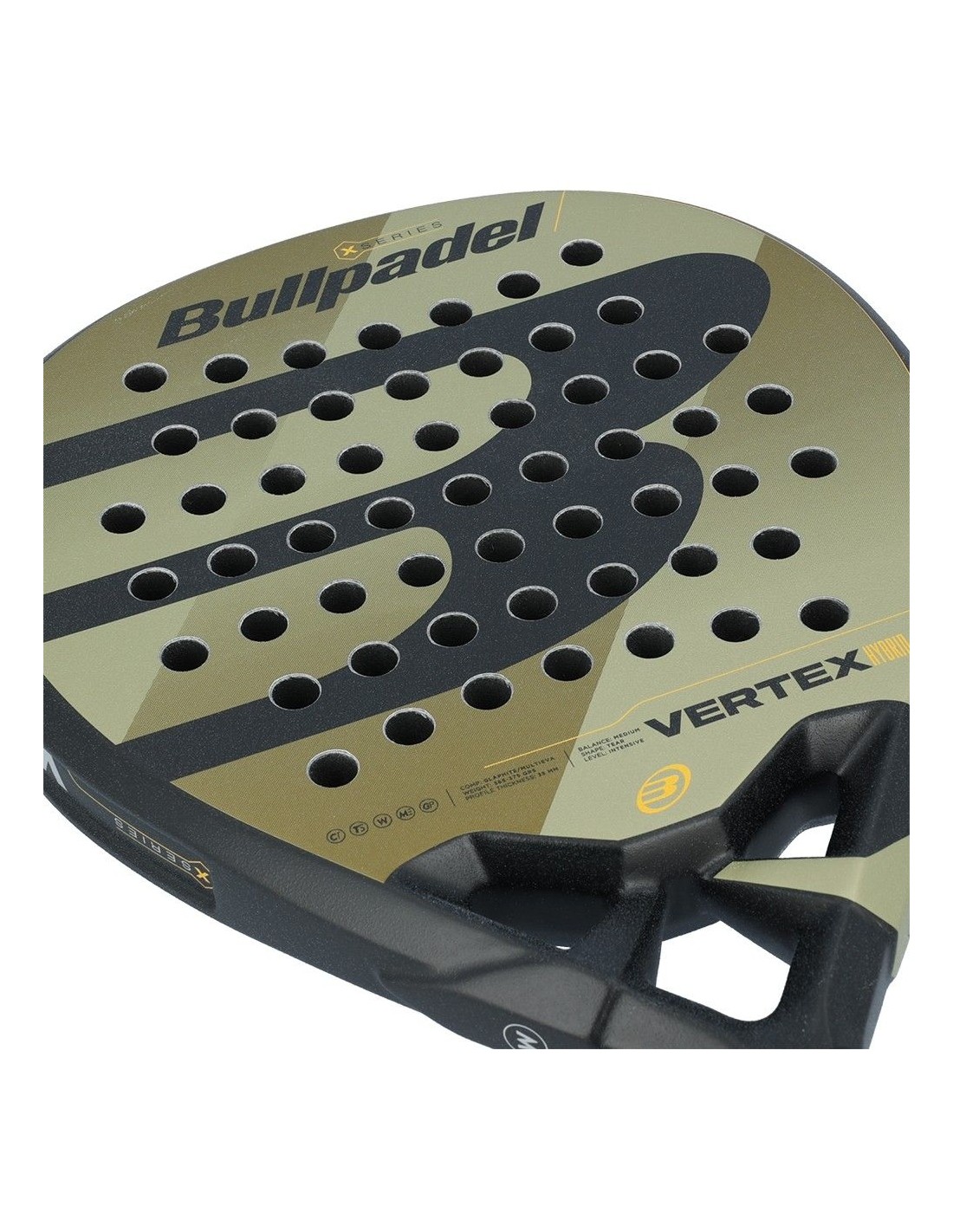 Mit einem modernen und unverwechselbaren Design zeichnet sich die Bullpadel Vertex 02 X Hybrid durch ihr anspruchsvolles Erscheinungsbild aus, ideal für Spieler, die ihre Power auf dem Platz steigern möchten. Die Carbonstruktur zeigt ein elegantes glänzendes Schwarz, während die goldenen Flächen mit rauem Finish alle Blicke auf sich ziehen. Die Details und das klassische Logo von Bullpadel in Schwarz vervollständigen dieses einzigartige Design.