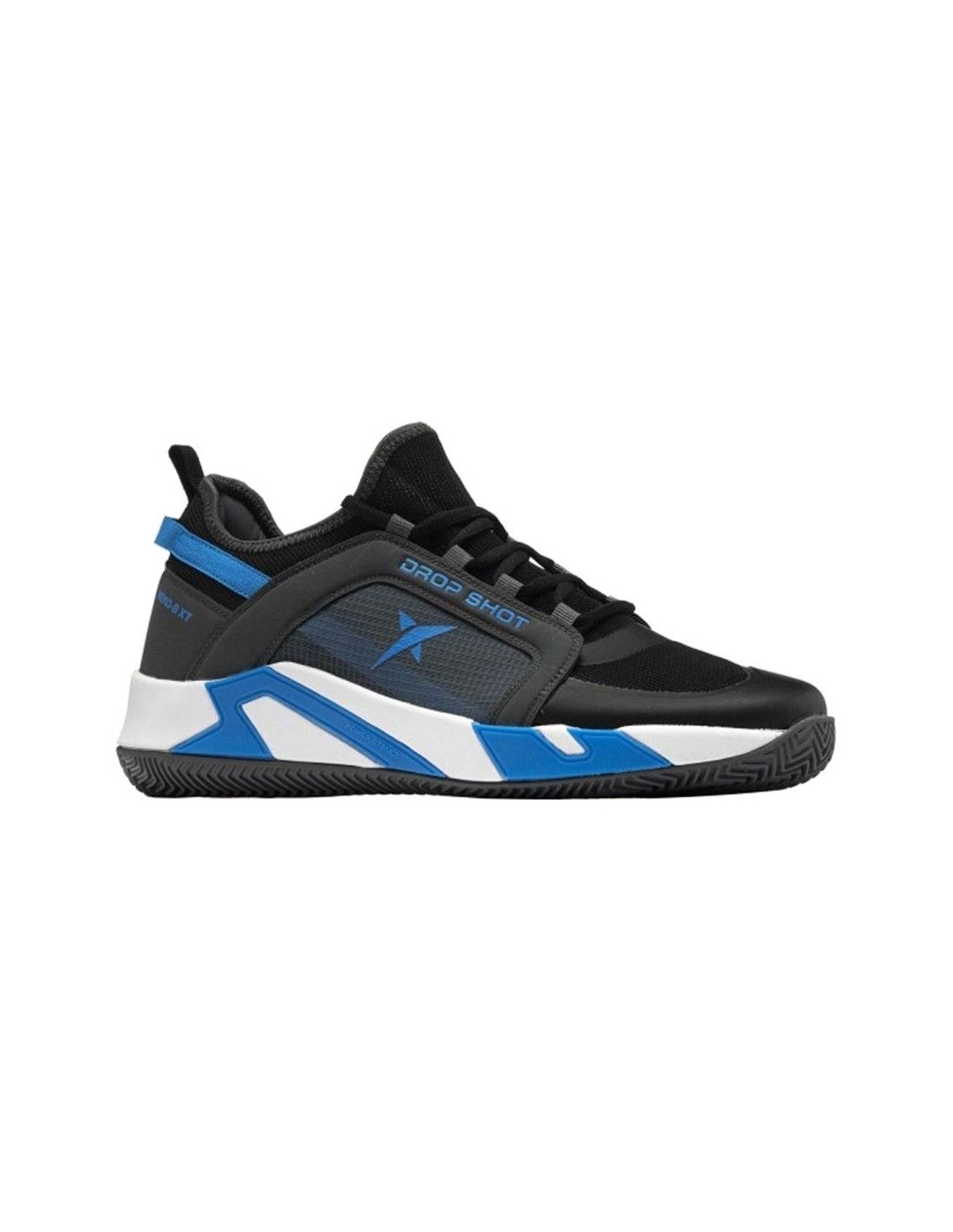 Das Design der Schuhe Drop Shot Neko B Xt präsentiert eine sportliche Silhouette mit einem hohen weißen Absatz, der im Kontrast zum vorherrschenden Schwarz steht, ergänzt durch blaue Linien an den Seiten.