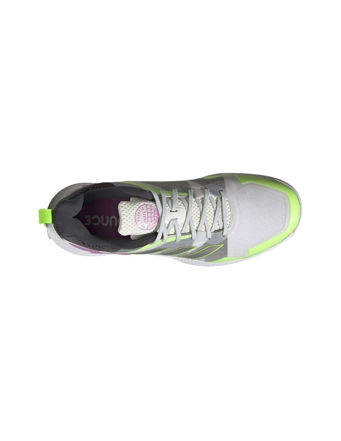 Diese Schuhe sind nicht nur funktional, sondern zeichnen sich auch durch ihr innovatives und auffälliges Design aus, mit einer vorherrschenden grauen Farbe im Obermaterial, weißen Details an der Sohle und grünen und lila Akzenten im oberen Bereich. Sie sind aus hochwertigen Materialien gefertigt, einschließlich eines Meshs, das die Atmungsaktivität maximiert, um deine Füße trocken zu halten, und bestehen zu 50% aus recycelten PrimeGree-Komponenten.