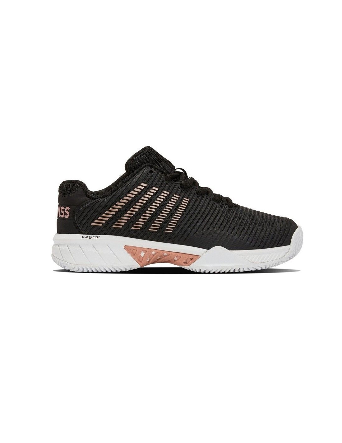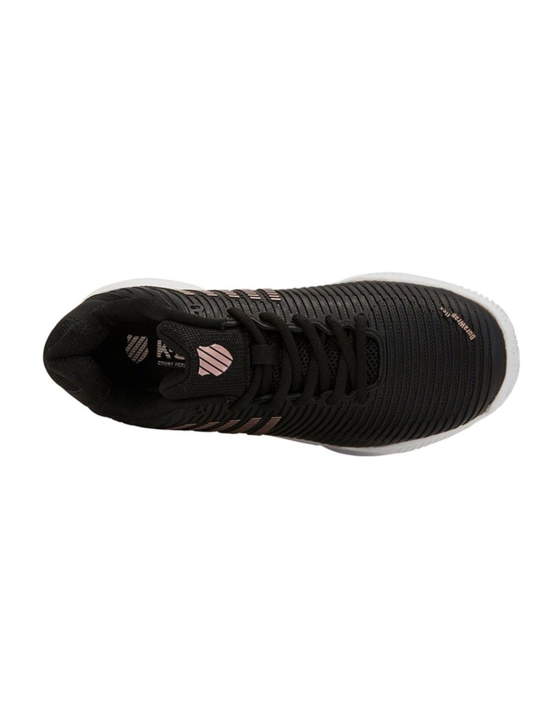 Das Außendesign kombiniert matte Schwarztöne, mattes Weiß und blasses Rosa mit den ikonischen diagonalen Linien des K-swiss Logos in Rosa.