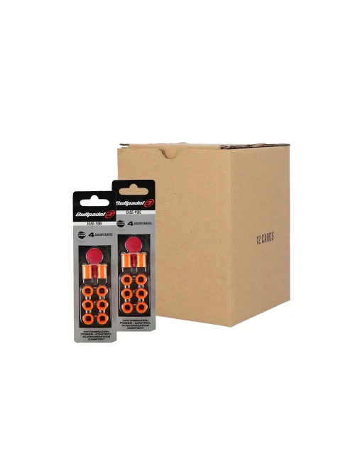 Pack mit 12 Blistern mit je 4 Einheiten des Antivibrator Bullpadel Ease Vibe in einem lebhaften Orangeton. Dieses Zubehör ist darauf ausgelegt, Vibrationen am Aufschlagpunkt zu minimieren und bietet überlegene Stabilität und außergewöhnlichen Komfort.