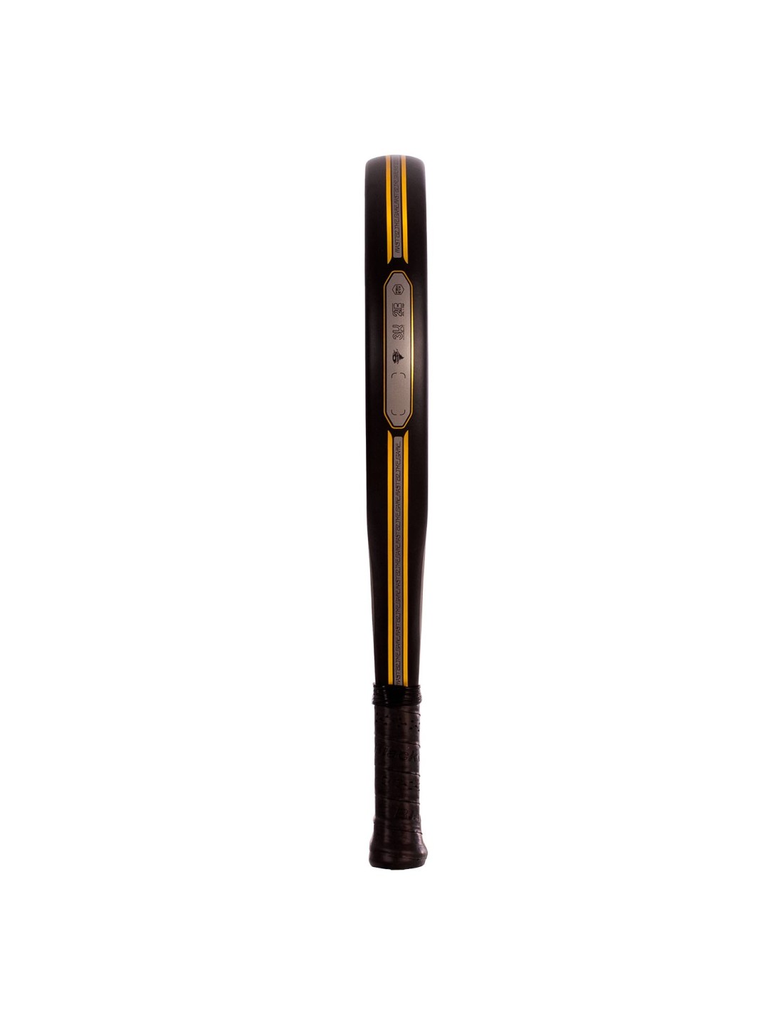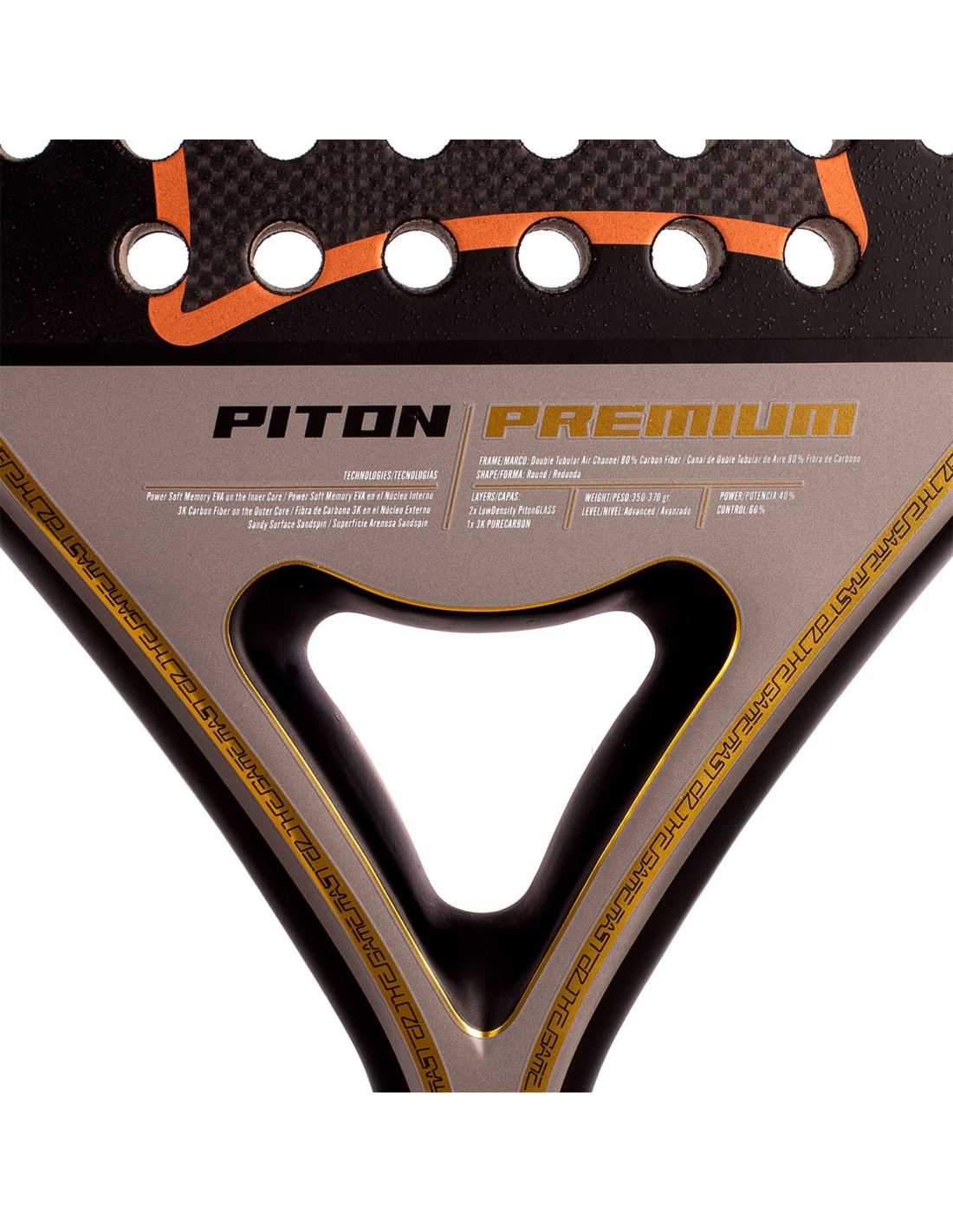 Sie verfügt über einen Kern aus Power Soft Memory Eva Gummi, einem Schaumstoff mit Dichte 17, der eine hervorragende Kombination aus Kontrolle und Power bietet, sowie eine unglaubliche Gedächtnisfähigkeit. Ihre Flächen bestehen aus zwei Schichten Low Density Piton Glass und einer abschließenden Schicht aus 3K Carbon Faser, was das Gefühl und die Präzision beim Platzieren des Balls verbessert. Die raue Sandspin Oberfläche erleichtert den Ballgriff, erhöht die Geschwindigkeit und den Effekt. Der 2 TB Rahmen, ein doppelter Carbon-Tubus-Rahmen, erhöht die Widerstandsfähigkeit und Haltbarkeit der Schläger.