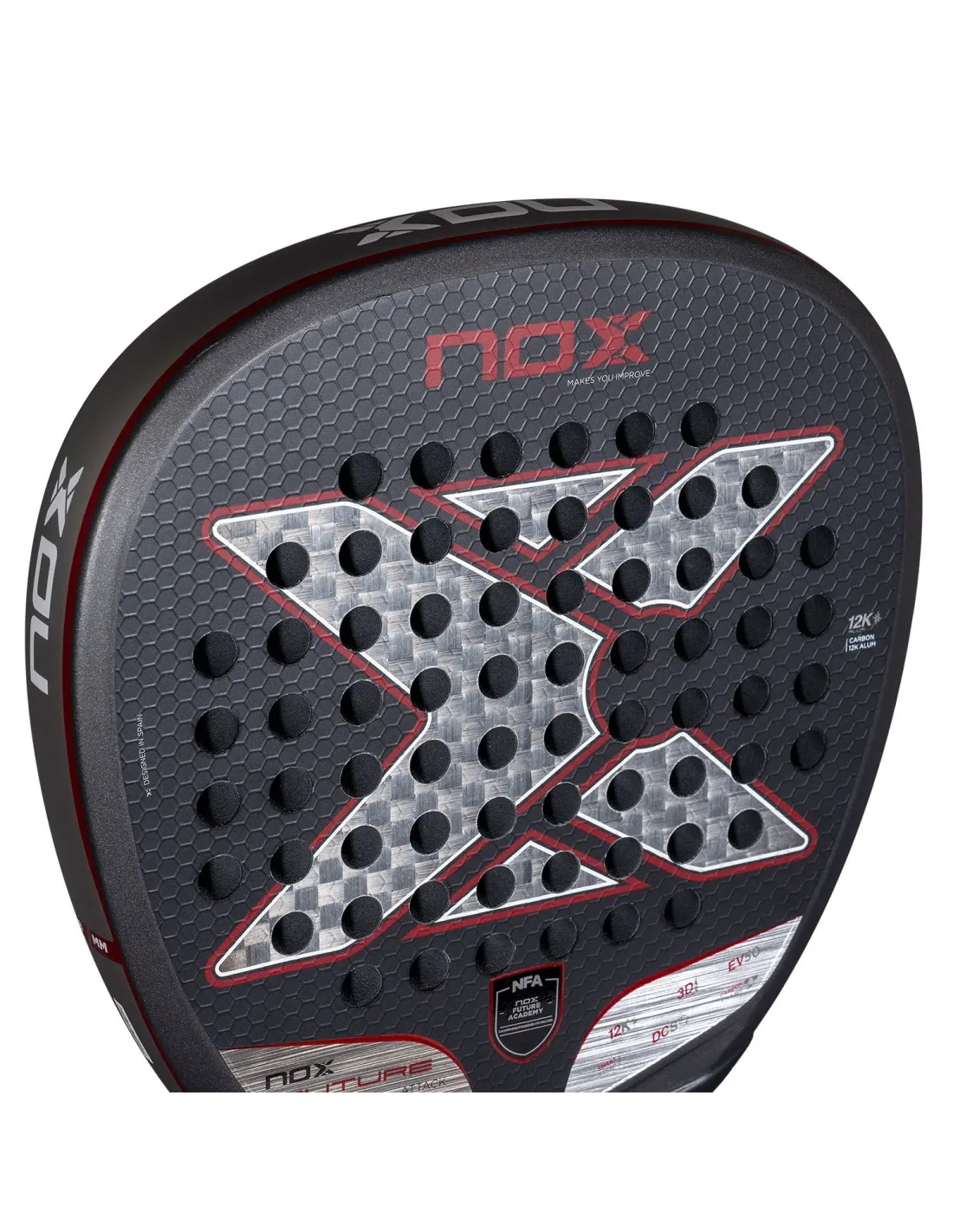 Die Nox Future Attack 12k Alum ist für diejenigen konzipiert, die ein offensives Spiel mit maximaler Power suchen. Ihre Diamant-Form verleiht ihr ein hohes Gleichgewicht, sodass die Spieler eine gute Kontrolle behalten und den Gegner unter Druck setzen können. Mit einem innovativen Design und erstklassigen Materialien verbessert diese Schläger die Kontrolle in der Nähe des Netzes.
