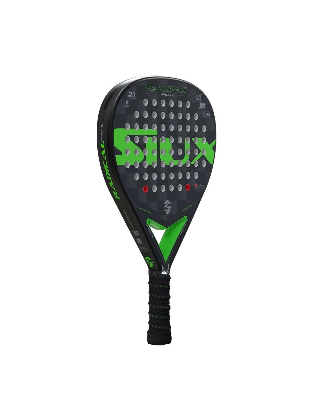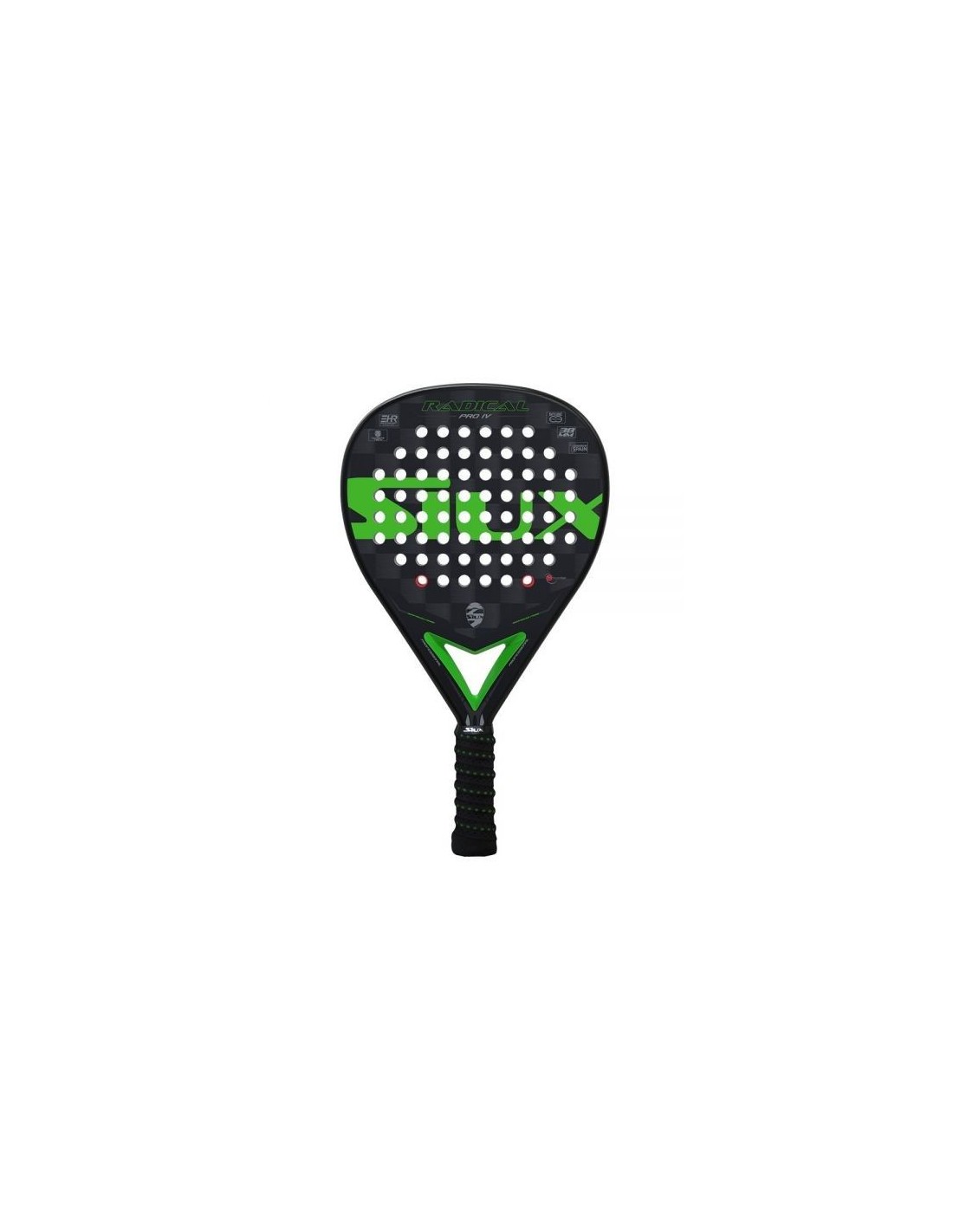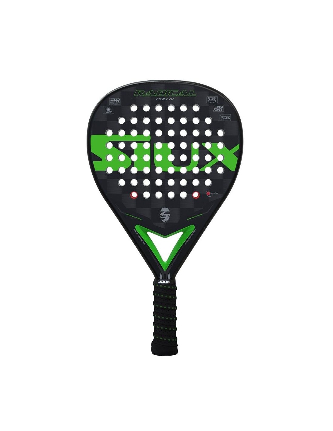 Diese Schläger präsentiert einen raffinierten schwarzen Rahmen, der einen Kern aus Black EVA-Soft-Gummi beherbergt. Ihr Design mit Karos in Schwarz- und Grautönen wird durch das auffällige Grün des Siux-Logos ergänzt.
