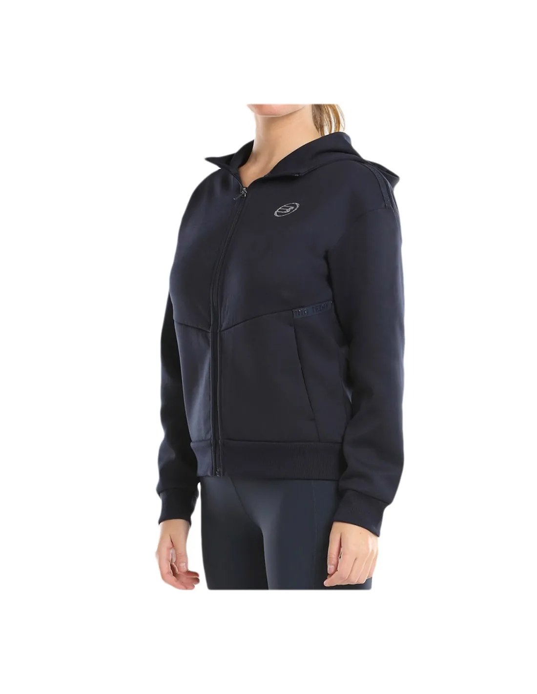 Sweatshirt Bullpadel for women, from the personal collection of the player Gemma Triay. This garment is made of interlock elastic polyester, a high quality material, which makes it more comfortable. Its design incorporates hood, zippered kangaroo pocket, rachel tape details, as well as rib cuffs and bottom.