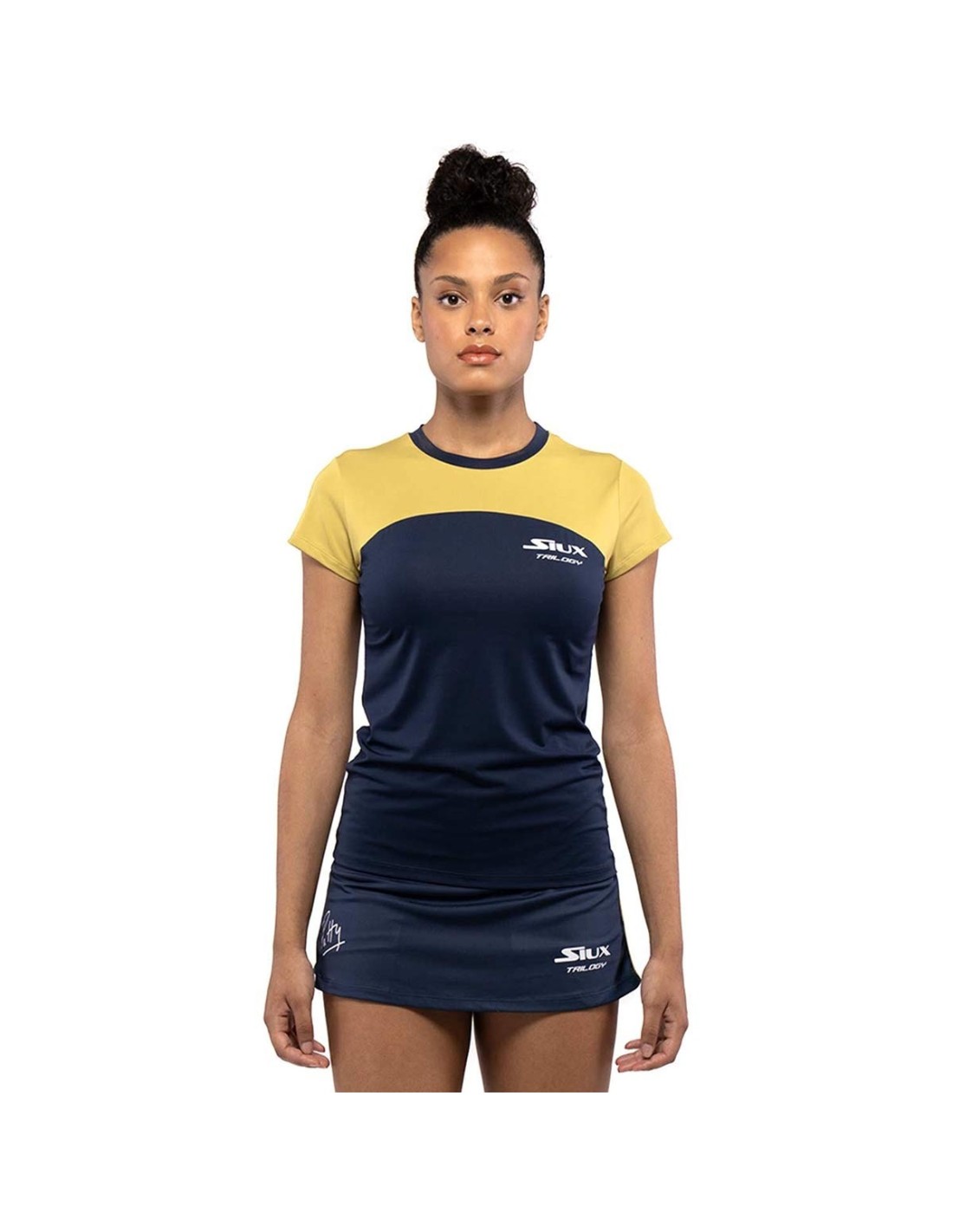 The short-sleeve Trilogy Patty t-shirt for women is made of fabric with Thermodry technology, an advanced dynamic drying technology that quickly absorbs sweat from the skin and transfers moisture to the surface of the fabric to evaporate, leaving the user comfortable and dry. It also features antibacterial finish fabric, a technology that neutralizes odor-causing bacteria on contact and keeps the fabric fresh for longer. A round-neck t-shirt with an innovative design of combined colors in navy blue and green fabric. The Siux Trilogy logo is found on the front, and the signature of the Murcian player, Patty Llaguno, is on the upper back.