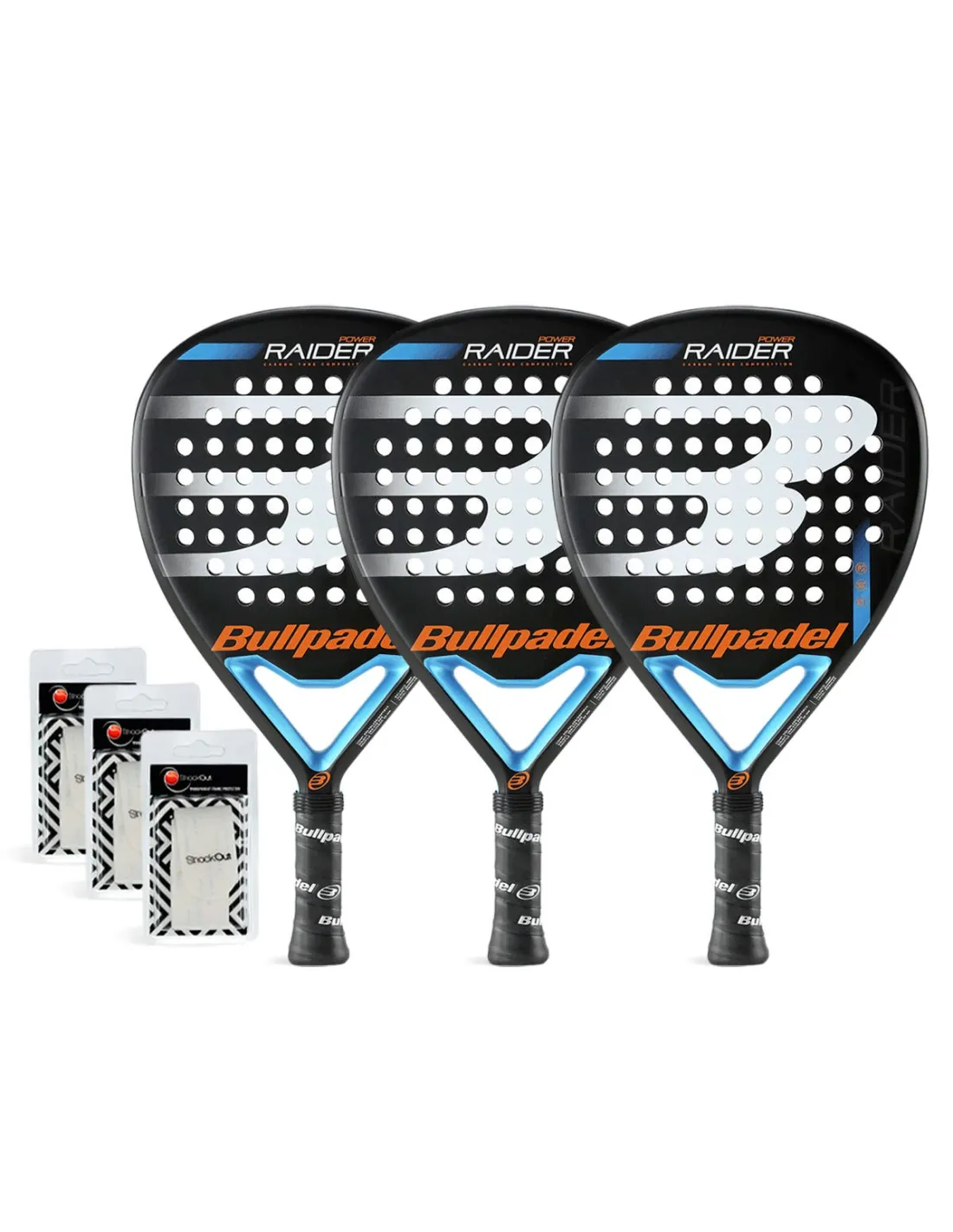 - Incluye tres palas Bullpadel Raider Pwr Blue.