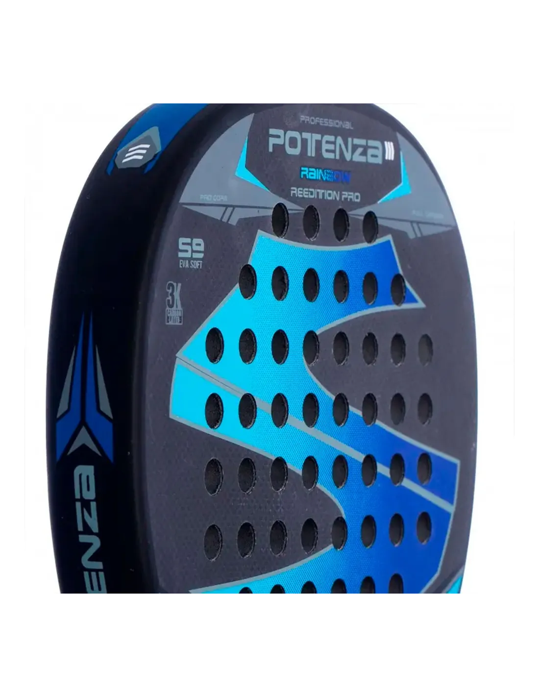 En cuanto a materiales, la Softee Potenza cuenta con un núcleo de goma EVA Soft S9, que absorbe impactos y reduce vibraciones para un golpeo más confortable y estable. Sus planos de fibra de Carbono 3k Layer, ligeros y resistentes, mejoran la durabilidad, Potencia y Control. Además, el acabado liso mate de sus caras añade un toque de elegancia y suavidad al juego.