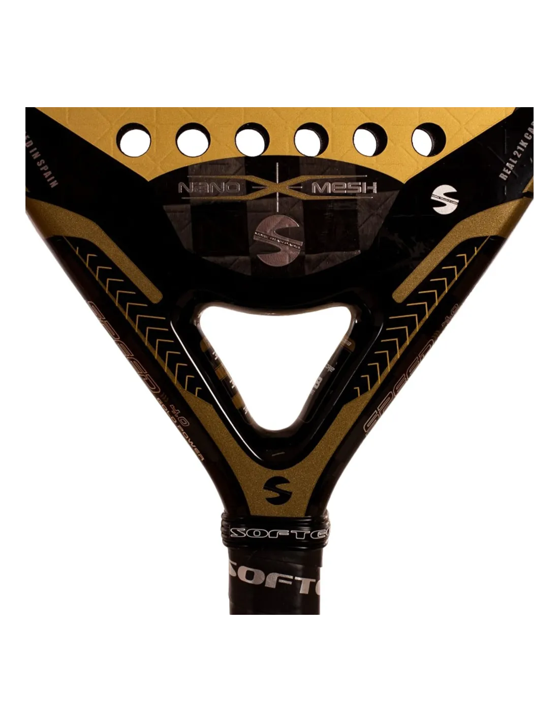 La Softee Speed Gold Power 4.0 Nano Mesh es una auténtica joya en la cancha. Desde el primer golpe, su impresionante acabado dorado y su construcción de alto rendimiento capturan la atención. Con su forma de lágrima y balance medio, esta Pala ofrece un equilibrio ideal entre Control y Potencia, adaptándose a cualquier situación de juego.