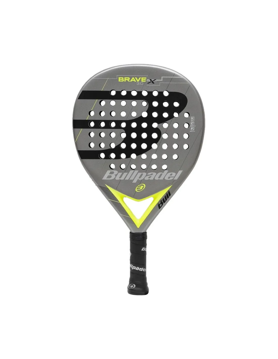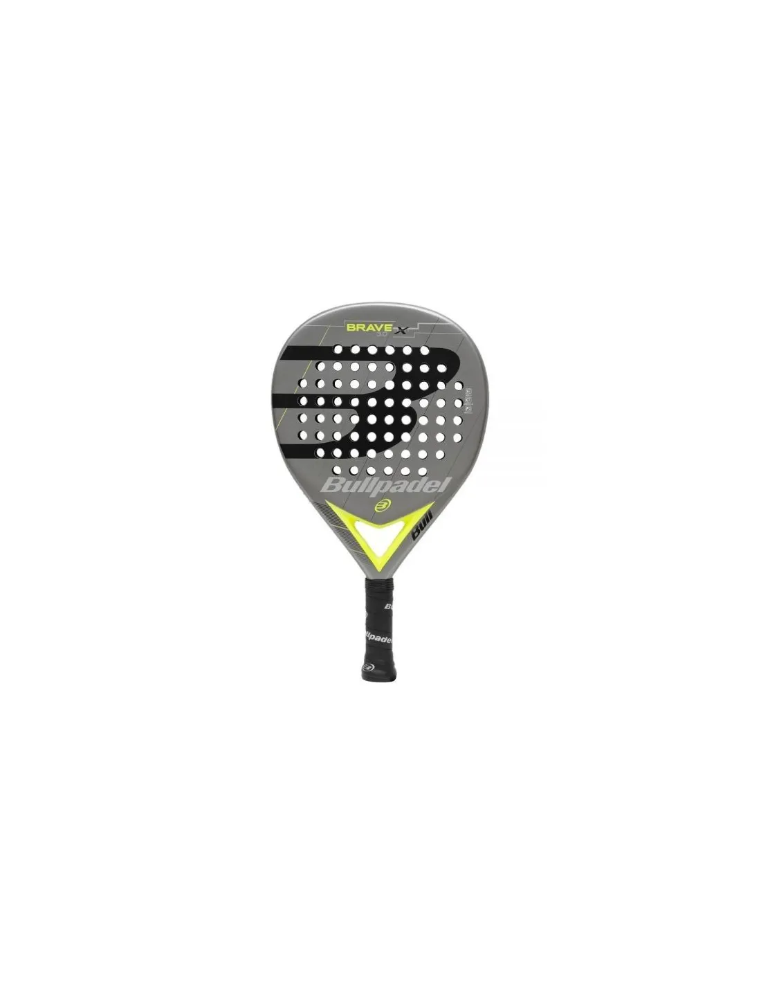 La Bullpadel Brave 3.0 tiene un diseño llamativo en forma de Lagrima, con una base gris que resalta el logotipo en negro y el nombre de la marca en blanco. Los detalles amarillos en el puente le añaden un toque deportivo y moderno.