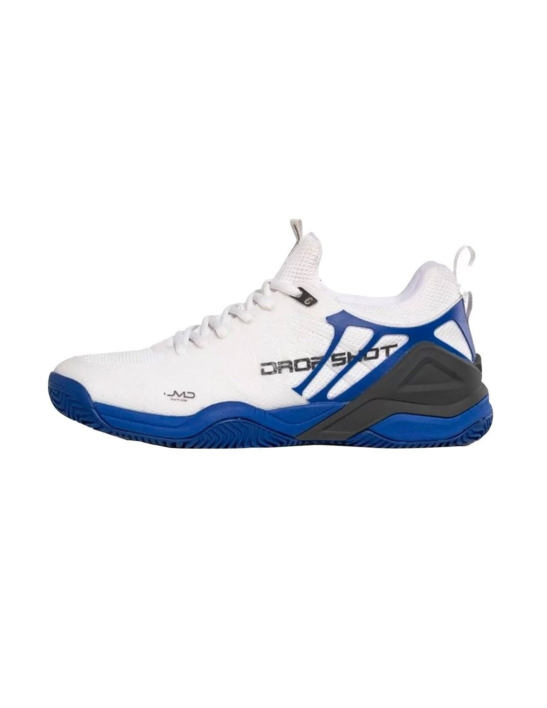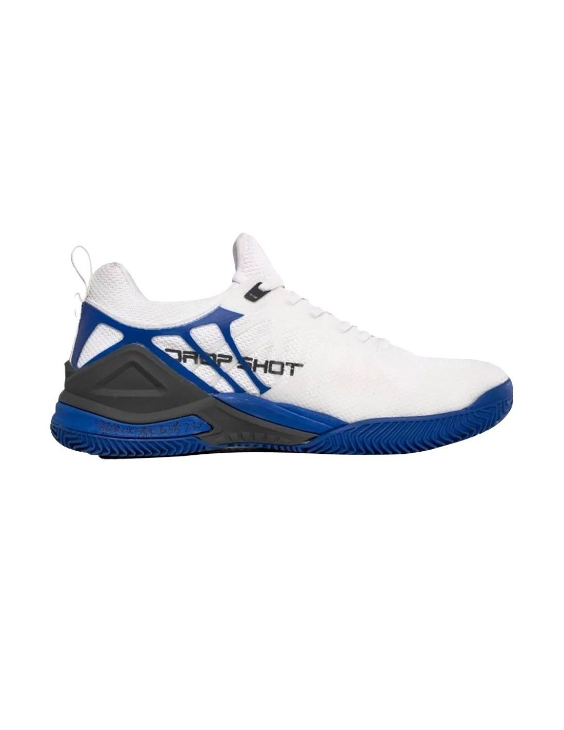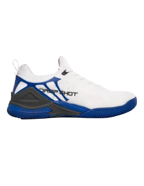 Estas Zapatillas cuentan con un refuerzo de caucho en la parte trasera de los costados, protegiendo tanto los talones como la unión del empeine con la planta del pie. Predomina un elegante blanco olímpico mate, adornado con patrones geométricos en cobalto en los laterales y bordes de la suela. La suela, con su textura acanalada en forma de grecas, asegura un agarre excelente. El logotipo de DROP SHOT se destaca en los laterales con una tipografía negra. Además, el cierre de cordones permite un ajuste perfecto, mientras que el cuello y la lengüeta, de tacto extra suave, previenen las rozaduras durante el juego.