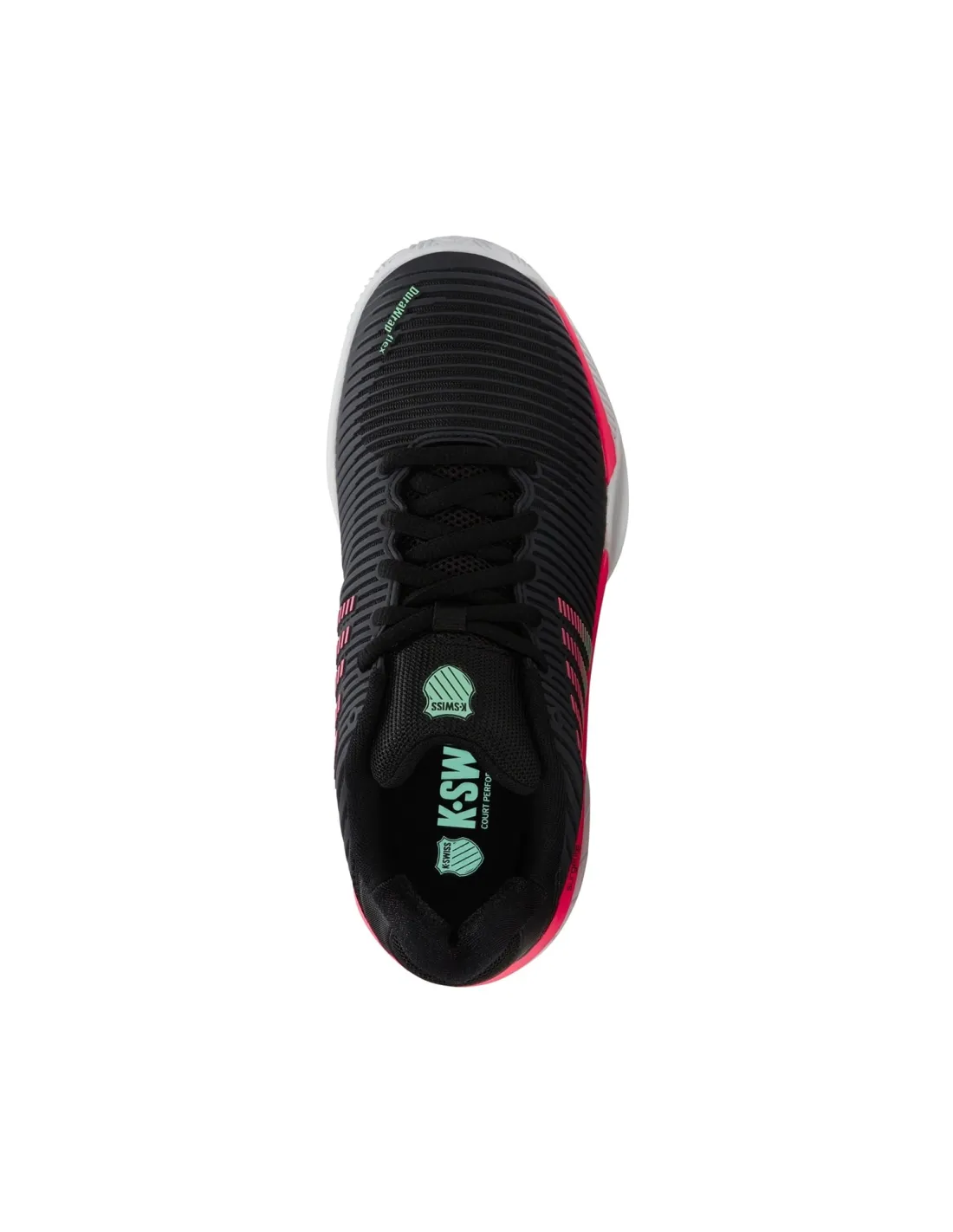 Les Hypercourt Express 2 de K-swiss en noir sont spécialement conçues pour les femmes qui apprécient la légèreté, le confort et la respirabilité dans leurs chaussures. Ces chaussures sont dotées d'une semelle Aösta 7.0, fabriquée en caoutchouc haute densité, offrant une résistance exceptionnelle à l'usure et une traction optimale.