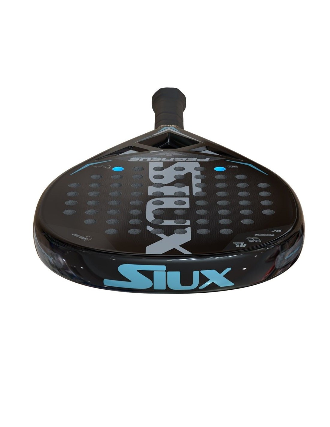 È pensata per giocatori adulti che cercano una racchetta che permetta loro di eseguire bandejas e volée con precisione e potenza. La sua forma ibrida, che combina elementi a goccia e diamante , la rende unica. Il telaio ha una elegante finitura in nero opaco, mentre le facce presentano un sofisticato grigio scuro. Al centro, il nome 'Siux' si distingue in un tono argento opaco.