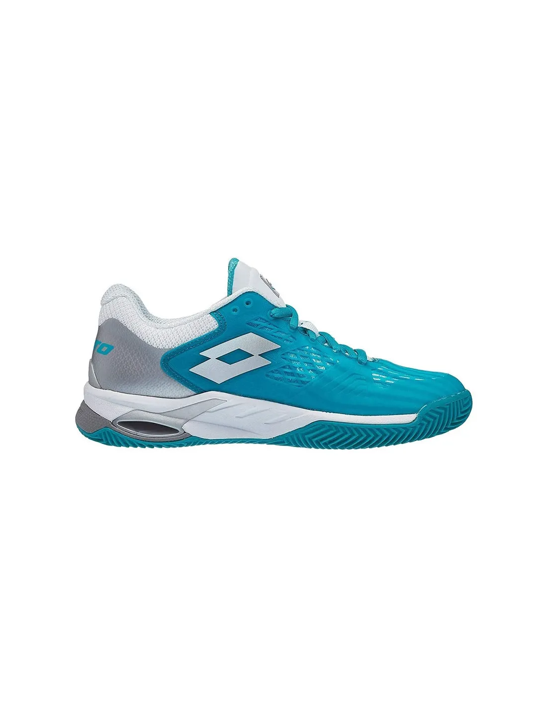 La struttura combina tonalità turchese opaco con dettagli in argento brillante e bianco, ottenendo uno stile accattivante senza perdere eleganza. Ai lati spicca il logo di Lotto, con i suoi iconici rettangoli paralleli in bianco.